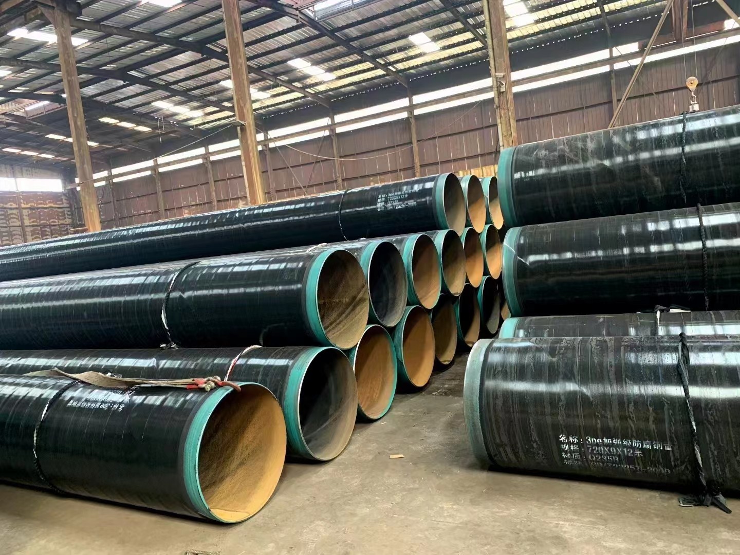 加强级3pe防腐钢管管道三层PE防腐结构:-层环氧粉末(FBE100um),第二层胶粘剂(AD)170250um,第三层聚乙烯(PE)